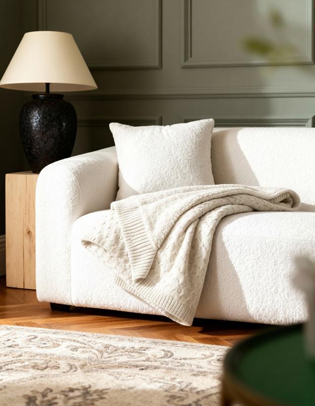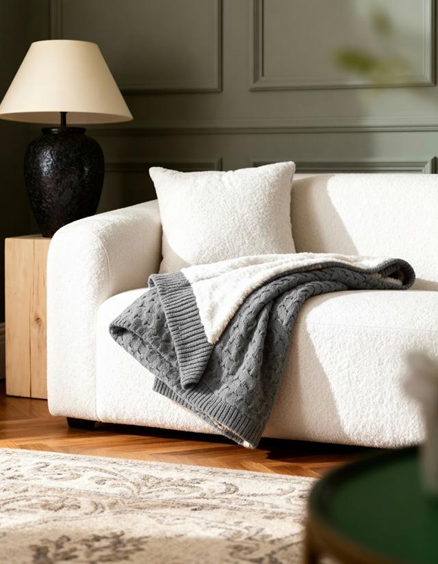 بطانية ديكور بنقشة بارزة ومبطنة بطبقة فرو ناعمة، توفر دفئًا إضافيًا ولمسة فاخرة، مثالية للكنب وغرف المعيشة والاستخدام اليومي.